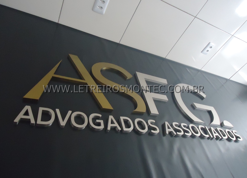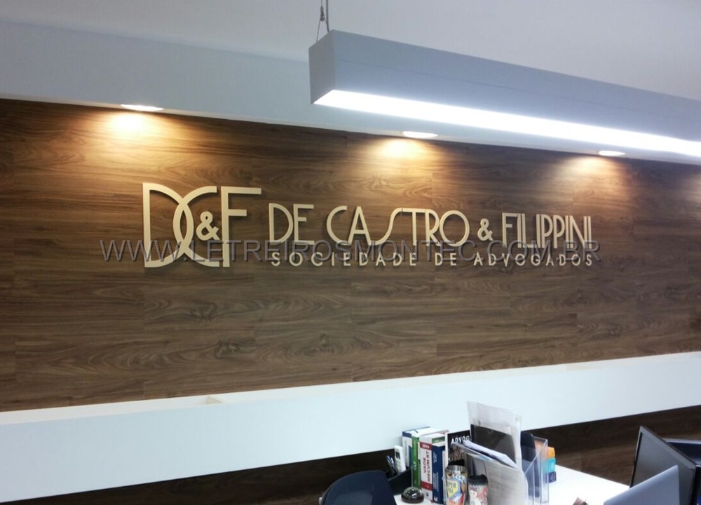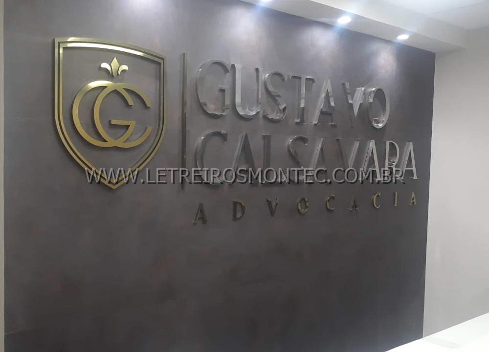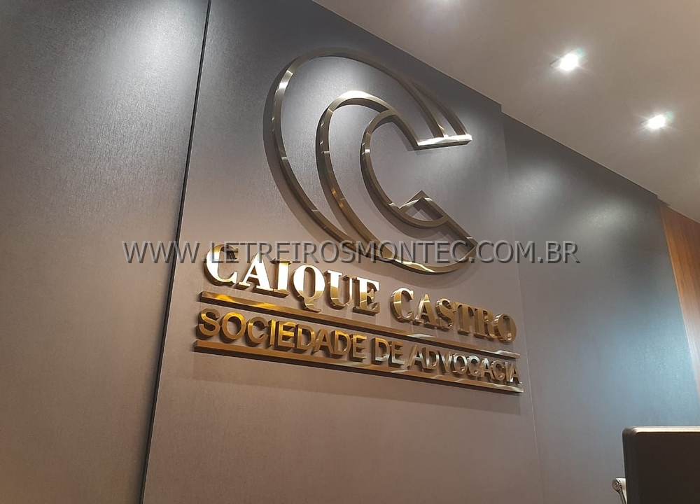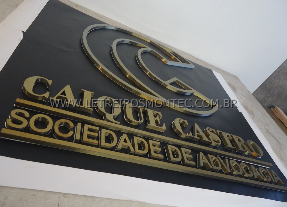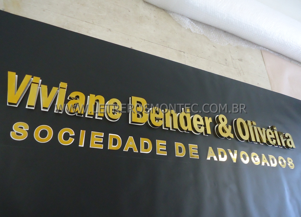 Letreiro escritório de advocacia latão dourado.