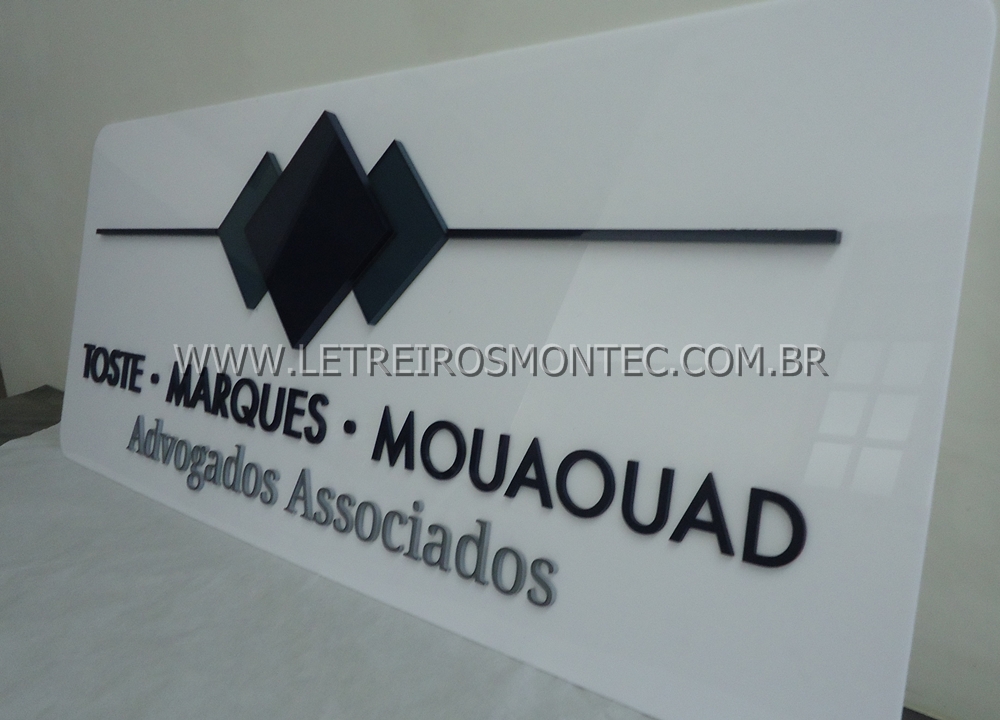 O letreiro para escritório de advocacia em acrílico pode ser pintado por trás das peças, mantendo o aspecto natural frontal do acrílico e ainda pode receber impressão inversa em casos de cores degrade e também pode receber pintura total nas cores da marca do cliente.