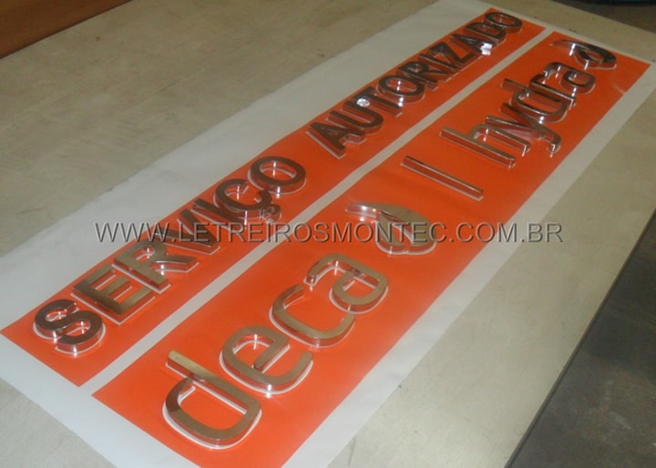 Ele valoriza o texto e o logotipo da marca dando destaque de nobreza produzido em material de primeira linha, pode ser fabricado logotipos complexos e textos com brilho refletivo que dá destaque da marca.