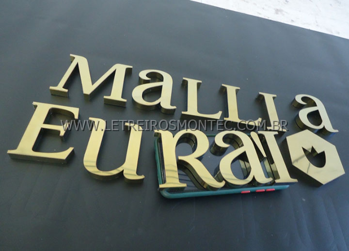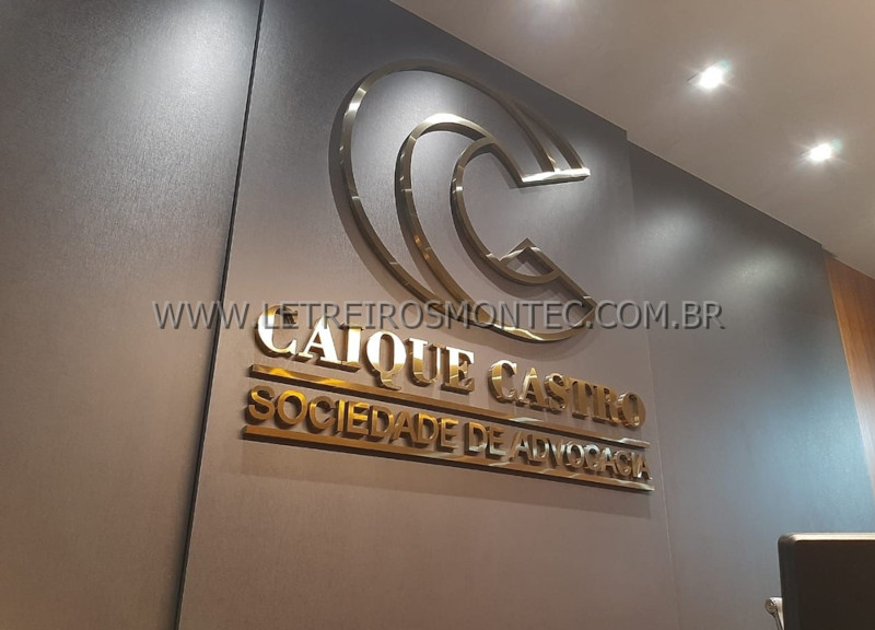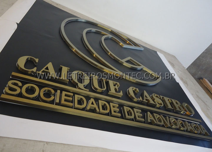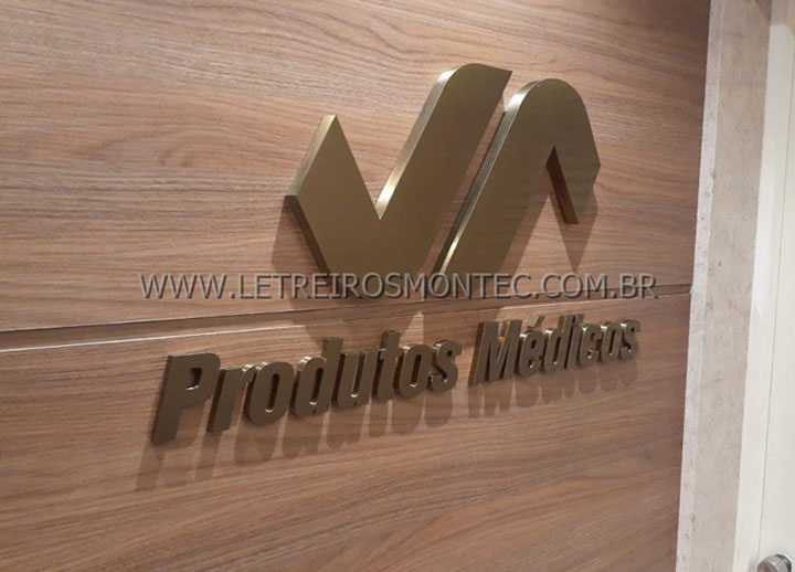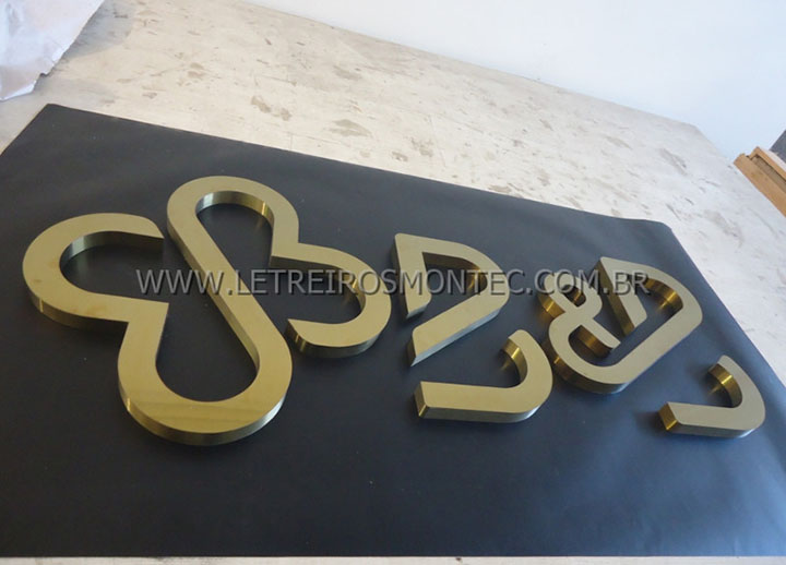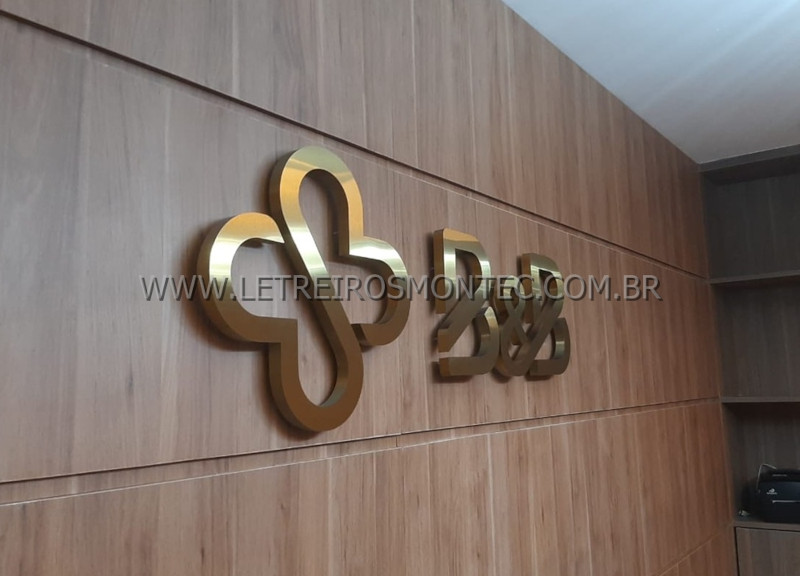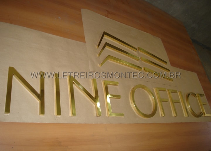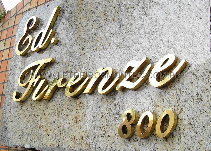 Textos e logos de metal dourado brilhante, polido ou escovado em alto relevo podem ainda receber iluminação indireta via led, descartando-se de forma sensacional no local instalado.