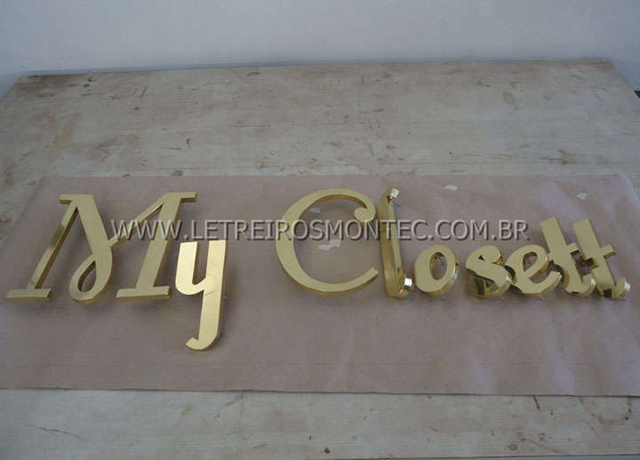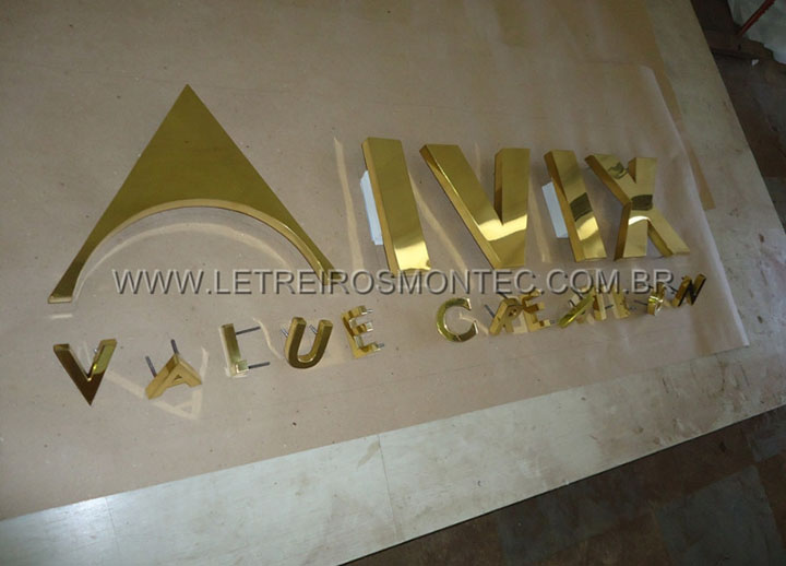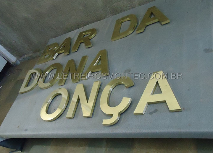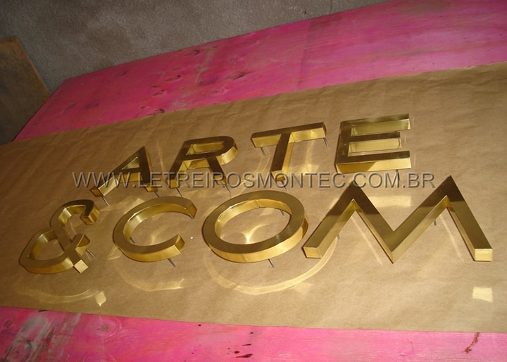 O material passa por vários processos até alcançar a finalização do letreiro dourado, seja no polimento ou na escovação, finalizado com verniz específico para este material.
